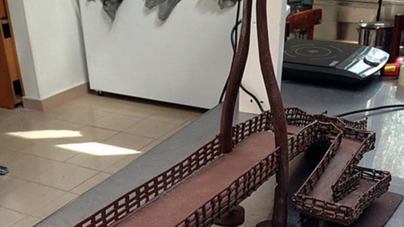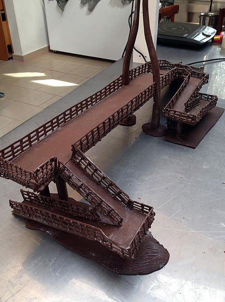 – Пожалуй, торт в виде пешеходного перехода на «Фортуне». Он полностью из шоколада. Я его делал целый месяц, пришлось долго проектировать. Моя идея была в том, что в торте ничего не должно быть, кроме шоколада. Никаких подвязочек или поддержечек. Если перила, то тоже из шоколада. Собирать торт пришлось уже на месте из заранее приготовленных отдельных деталей.