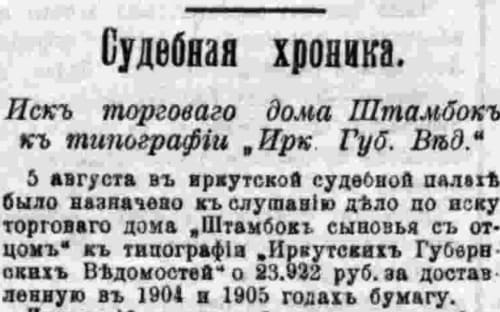 Возникло это дело по иску торгового дома Штанбока к типографии «Иркутских губернских ведомостей», и речь шла о пятилетней давности поставках бумаги. Предъявленные счета показались сомнительными, и возникло предположение, что указанная бумага не поставлялась, а значит, Штамбок с Виноградовым были в сговоре. Будь Александр Иванович жив, он, наверное, дал бы необходимые пояснения и о закупках бумаги впрок из-за забитости железной дороги, и о возросших в войну тиражах, и о многом, многом другом. Но Виноградов умер в самом начале процесса, а бывший его подчинённый Горайский, ныне редактор «Иркутских губернских ведомостей», свидетельствовал исключительно в свою пользу. Горайскому, известному продажей казённой бумаги, явно хотелось остаться в скромной роли свидетеля.