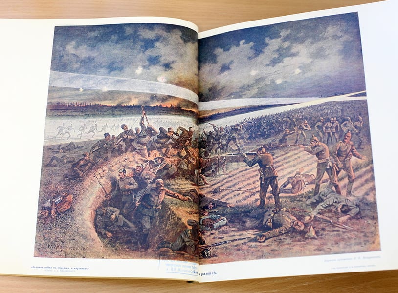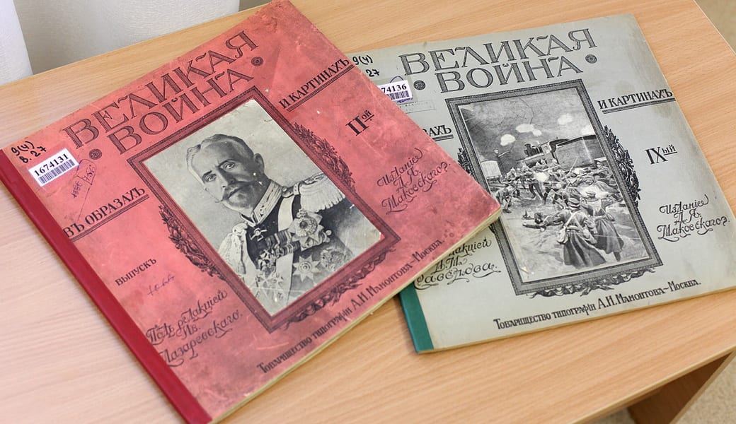 Самое интересное и красочное российское издание, посвящённое первой мировой, – «Великая война в образах и картинах». В своё время вышло 14 выпусков этого подарочного военно-патриотического издания, полный комплект экземпляров хранится в библиотеке Молчанова-Сибирского. «Для издания были привлечены лучшие умы, лучшие творческие силы того времени, – говорит Наталья Суханова. – Одни из них писали тексты, другие занимались художественным оформлением. Среди людей, которые работали над книгой, – академики искусств Константин Маковский, Николай Рерих, известные художники Николай Самокиш, Алексей Кравченко и другие. В создании военно-литературного отдела приняли участие граф Алексей Толстой, академик Семёнов-Тян-Шанский. В книгах были собраны документальные исторические справки как о воюющих странах, так и об имеющемся у них вооружении. Примечательно, что именно в этой серии были впервые представлены и описаны все виды новейшего оружия начала ХХ века. Есть статистические данные по вооружению, списки главнокомандующих, архивные материалы, подлинные фотографии с мест событий, рисунки воинов. К примеру, «Атака французов», «Самый большой блиндированный автомобиль Германии», «Памятник Данте, минированный австрийцами». Иллюстрации и фотографии придают особую яркость изданию, наряду с чёрно-белыми есть и цветные, многие фото вклеены на специальных листах, покрыты папиросной бумагой. «Для начала ХХ века это просто потрясающие издания, – говорит библиотекарь. – У нас сохранились выпуски под оригинальными обложками, в современных антикварных магазинах можно найти все 14 выпусков, собранных в одном переплёте или в виде двухтомника».