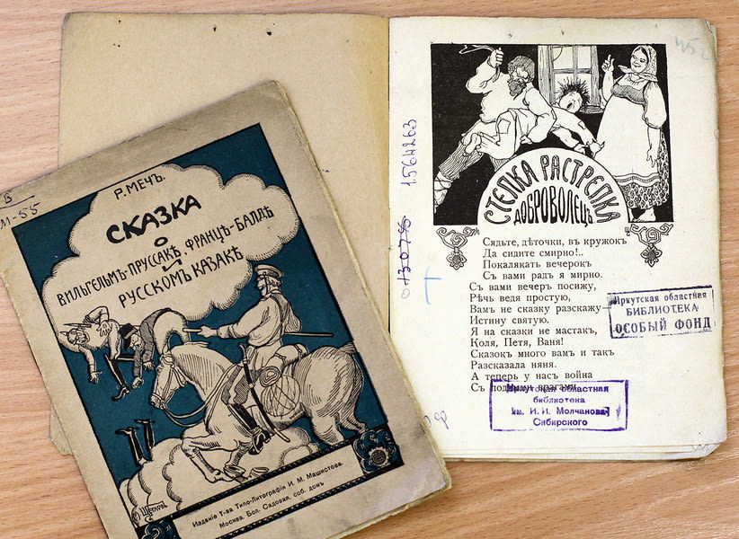 «Жил-был Вилли-пруссак, отточенный тесак...» – этими словами начинается сказка о Вильгельме-пруссаке, затеявшем войну. Маленькая книжка-агитка, распространявшаяся среди русских солдат во время первой мировой войны, стоила в 1915 году пять копеек. Сейчас в антикварных магазинах её цена куда как выше. Солдаты прятали книжки в сапоги, и немногие из них сохранились на войне. А ведь после неё уже прошло целое столетие. Но в «Молчановке» до сих пор хранятся эти маленькие книжечки, ставшие за прошедший век книжными памятниками.