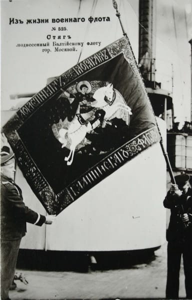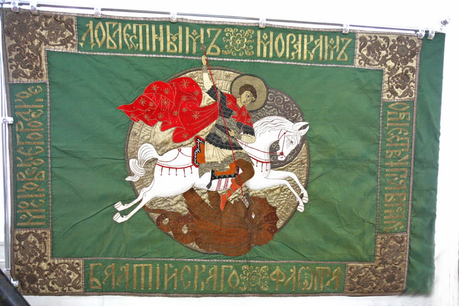 Ещё один уникальный экспонат поступил в музей в те же годы – «доблестным защитникам балтийского флота». «У него уникальная судьба: стяг был преподнесён Московским городским управлением защитникам Балтики, – рассказал Сергей Шуперт. – После революции его тайно вывезли в Омск, где передали адмиралу Колчаку, который начинал войну как раз на балтийском флоте. Стяг следовал с Колчаком до самого Иркутска, после ареста адмирала был изъят, а затем иркутская ВЧК также передала его музею. Поэтому он сохранился в идеальнейшем состоянии, единственное – у него нет древка, поскольку, когда его везли, естественно, с древка полотнище было снято. Мы связывались с нашими коллегами, в частности иркутским историком, профессором НИ ИрГТУ Павлом Новиковым, пытаясь узнать о стяге как можно больше. Нам предоставили информацию из московских архивов, и теперь у нас складывается полная картина по поводу этого экспоната. Долгое время он проходил у нас как «андреевский флаг». С оборотной стороны действительно есть андреевский крест, но сам стяг андреевским знаменем не является. Когда экспонат хранится под спудом и учёные не имеют доступа к нему, он и остаётся безликим. Но в том случае, когда учёные подходят к таким вещам вплотную, начинаются открытия. Иначе этот стяг так и хранился бы как образец знамени царской армии, хотя как таковым боевым знаменем он не являлся, это всего лишь дань уважения горожан-москвичей защитникам Балтики».