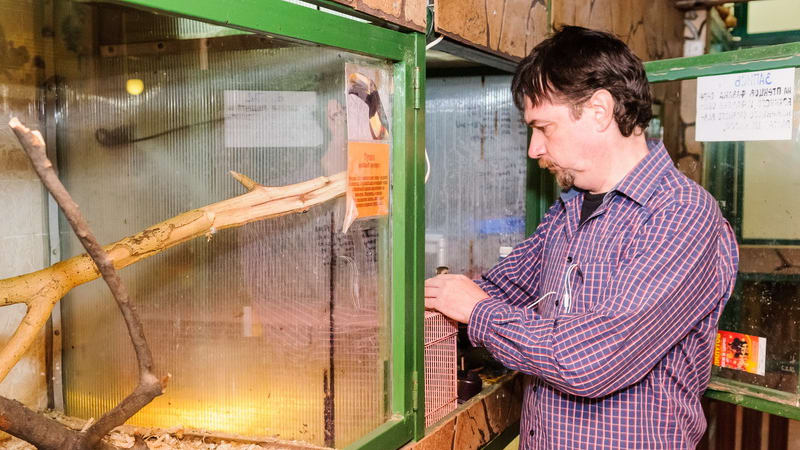 В мае этого года в зоопарке появился новый сотрудник – Евгений Ширстов, переселенец с Украины. Он приехал по приглашению Вадима Ивушкина, с которым давно по­дружился в Интернете на теме общей любви к орнитологии. И все выжившие птенцы последних месяцев – его выкормыши.