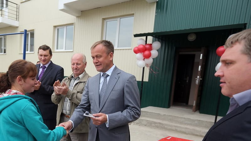 На импровизированную сцену, устроенную около одного из подъездов, выходит Сергей Ерощенко. Каждому из присутствующих он вручает ключ почти что от новой жизни.