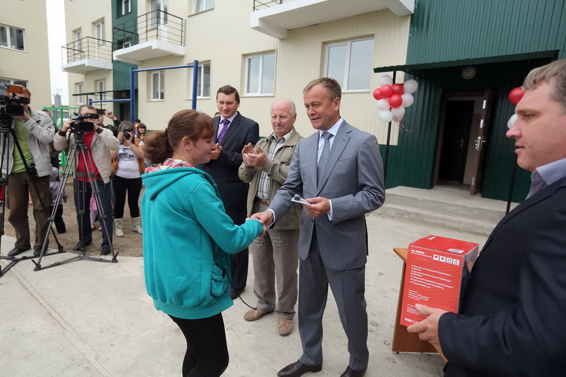 В Хомутово под Иркутском построили три новых трёхэтажных дома. На некоторых окнах уже висят кружевные занавески, видны цветы. Дом сдан ещё в середине июня. Но хозяева тридцати одной квартиры собрались около подъезда лишь на прошлой неделе: им пришлось подождать, пока будут подписаны все документы. Зато и ключи от квартир им вручал губернатор Иркутской области Сергей Ерощенко. Этим символическим жестом государство даёт путёвку в жизнь сиротам, получившим собственное жильё.