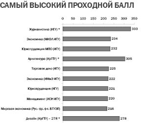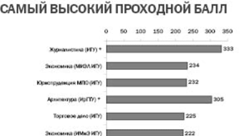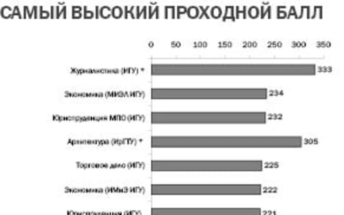 Конечно, одной гребёнкой здесь не обойтись. Минимальный проходной зависит как от вуза, так и от направления. Скажем, для поступления в ИГУ на «Геологию» достаточно было иметь минимальные для университета 100 баллов, а вот на «Журналистику» потребовалось (с учётом дополнительных пунктов творческого конкурса) минимум 333. В ИрГТУ разброс был от 96 по ряду специальностей до 305 из 400 у архитекторов. Самый низкий проходной в БГУЭП – 120, на «Землеустройстве и кадастрах», самый высокий, как и положено, на различных профилях экономики – от 206 до 226.