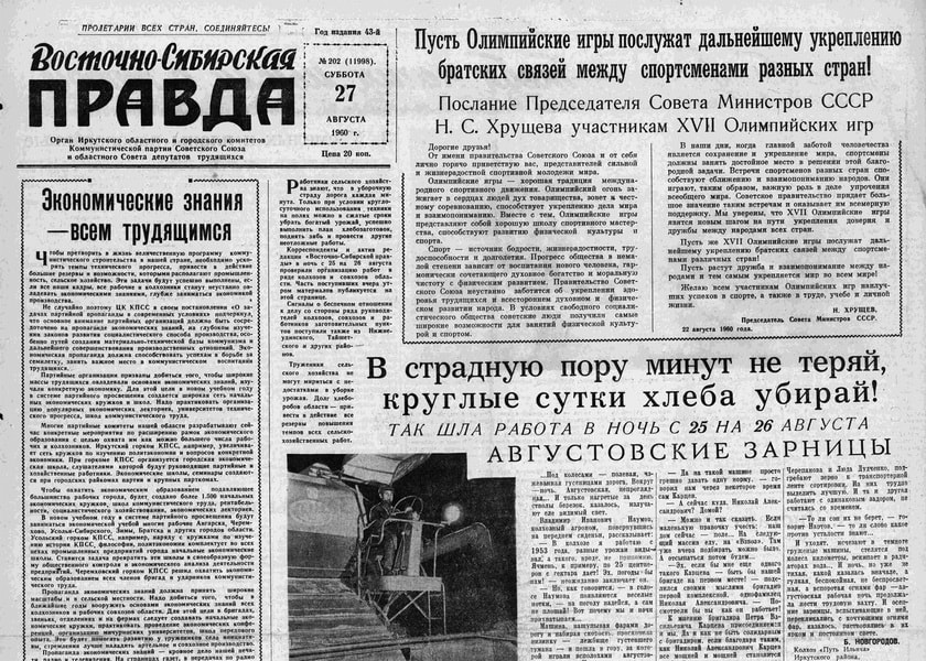 На первой странице также напечатано послание Никиты Хрущёва участникам XVII Олимпийских игр. Здесь же большая статья, посвящённая битве за урожай, а также сообщение о том, что в эти дни в Иркутске проходит Всесоюзное совещание гидростроителей.