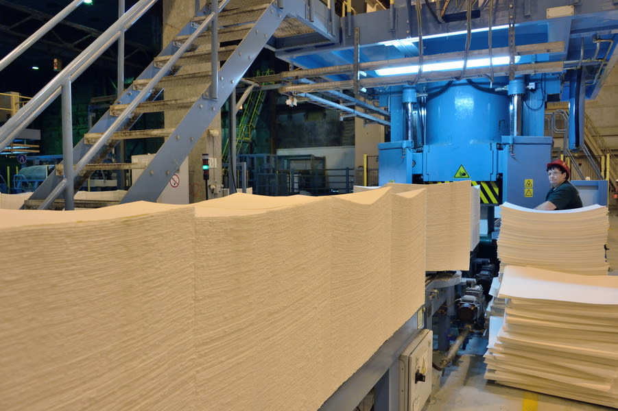 Сам же комбинат работает круглый год без выходных. На экране в зале пульта управления – разные стадии производственного процесса. Вот щепа поступает в котёл, вот – варка, горячее сортирование, отбелка, сушка, пресс-пат. Операторы видят, как работает оборудование, и в любой момент могут внести коррективы в режим с клавиатуры компьютера.