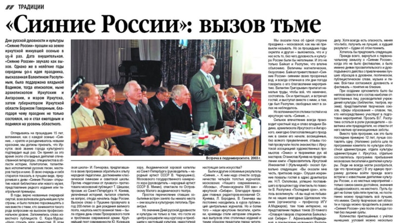 Разумеется, нельзя сказать, что «Сияние России» встречает единодушный восторг. Недовольные были и есть, однако речь не о предвзятости или разности вкусов. Мероприятие проводится, но спросим: изменилось ли пространство вокруг нас? Стало ли меньше вывесок на иностранном языке, прибавилось ли русских песен на радио-, телеканалах и сценах? Пишут ли студенты гуманитарных факультетов работы о творчестве известных поэтов, прозаиков, публицистов после живого общения с ними? А ведь каждую осень у нас действует настоящий семинар по отечественной культуре, где поднимаются проблемы современной литературы, истории, геополитики, выступают известные артисты и певческие коллективы. Назову только несколько имён из более сотни гостей, побывавших в Иркутске и городах области: Юрий Кузнецов, Владимир Костров, Василий Белов, Виктор Лихоносов, Леонид Бородин – с двумя конференциями по его книгам; Станислав Куняев, Ксения Мяло, Александр Панарин, Иван Гончаров, Николай Зиновьев, Борис Екимов, Диана Кан; певцы Александр Ведерников, Татьяна Петрова, Леонид Харитонов, киноартисты Георгий Жжёнов, Василий Лановой. Надо глубже осознать, что «Сияние России» несёт в себе часть русского мира, объединяющего очень многих людей и потому необходимого, дающего силы выстаивать в новых испытаниях.