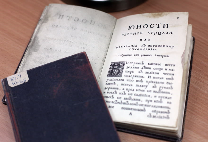 Анна Малых берёт в руки две маленькие книжечки, похожие, как близнецы. «Юности честное зерцало» – литературно-педагогический памятник начала XVIII века. Это, конечно, не подлинные издания. Это факсимиле – полное графическое воспроизведение рукописи, рисунка, чертежа. Одна книжечка 1976 года, вторая 1990 года. «Факсимиле тоже бывают разные, одно заметно более качественно, другое – похуже. И такое случается, – улыбается Анна Малых. – Когда берёшь в руки качественное факсимиле 1976 года, кажется, что в руках старая книга, на верхней крышке переплёта есть неровности, которые присутствовали и на оригинале. В такой книге с максимальной точностью воспроизведена каждая деталь оригинала – на факсимиле перенесены все углубления, трещинки, воспроизведено блинтовое тиснение корешка, все пятна, имевшиеся на бумаге оригинала. Поскольку бумага оригинала была ручной работы, то в факсимиле на просвет можно увидеть полосы, характерные для производства такой бумаги – так называемая бумага верже. Факсимиле воспроизводит и это. На менее качественном экземпляре мы не увидим ни тиснения, ни углублений, сходство с оригиналом есть, но очень грубое. Так вот, первое факсимиле выполнено с оригинала, а второе – с первого. Если вы заинтересуетесь факсимильными изданиями, выбирайте те, что наиболее похожи на оригинал».