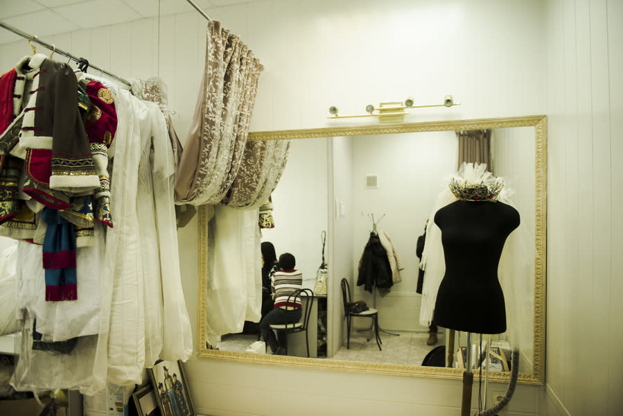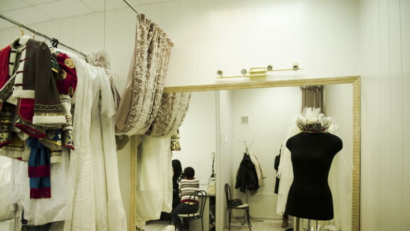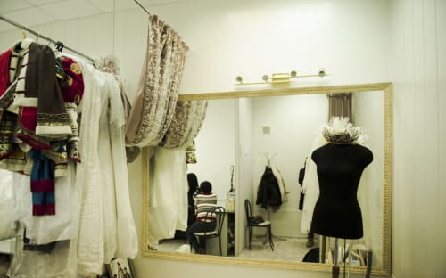 Главный предмет в ателье, то, без чего не обойдётся ни один модельер, закройщик, портной – это стол, большой стол, без него никак нельзя. Портновский метр, калька, ножницы, парогенератор, хороший утюг, оверлок, две швейные машинки – всё это важные и незаменимые спутники швейного процесса. На маленьком подиуме у большого зеркала происходят подгонки, подкалывания, примерки, весь волшебный процесс создания нового наряда. В рулоны закатана тесьма – самая разнообразная, красивая и интересная, она активно используется в свадебных этнических платьях и нарядах. Кстати, за этникой в ателье идут не только невесты, но и танцевальные коллективы, участницы конкурсов красоты, просто клиенты, желающие одеться нетривиально и стильно.