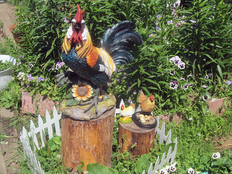 Ходят по усадьбе петухи, зайчики и гномы, важные дамы, аисты летают, утки плавают в пруду, костерок готов к труду, и солнышко зовёт к обеду…  С наступлением темноты солнышко оживает множеством огоньков, и на участок падает сеть  светящихся ломаных теней. И всё это утопает в море цветов и чудесных ароматов. Только роз аж двадцать кустов. Целая сказка на небольшом участке земли.