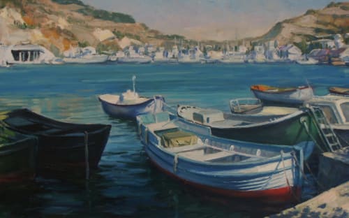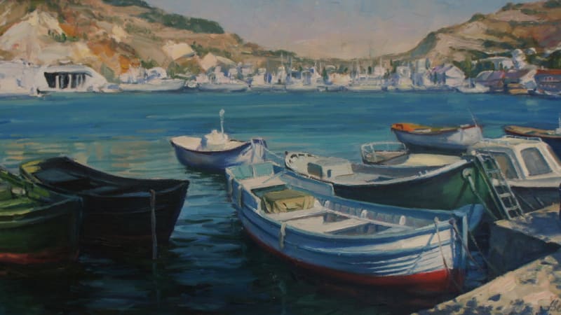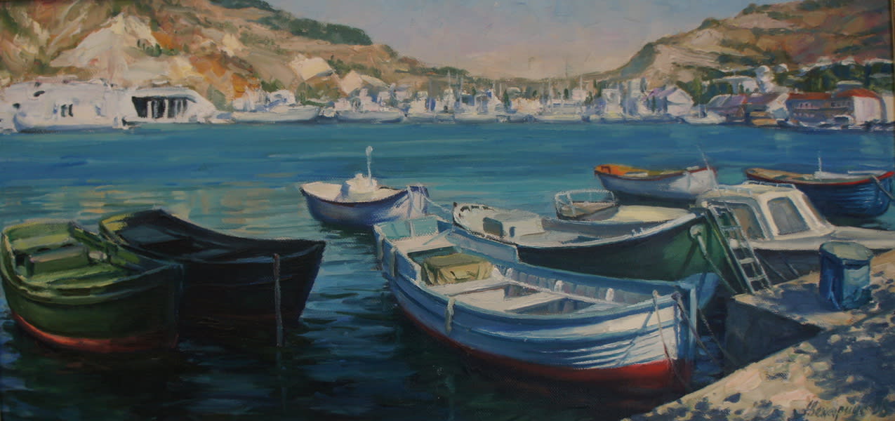 Взять, к примеру, крымский цикл, созданный во второй половине 1990-х. Сколько в них солнечной благодати, экзотики и, если хотите, умиротворения. Одни лишь названия уже передают содержание и настрой живописных полотен: «Крым. На старых улочках Бахчисарая. 2007», «Крым. Бахчисарай. Староселье. 2007», «Сфинксы над Бахчисараем. 2007». Насыщенные по цвету и колориту, они передают настроение автора, его удивление и восторг. Сильное впечатление вызывает картина «Обрывы мыса Тарханкут. 2008». Крошечные, едва различимые фигурки людей над наслоениями каменных громад, омываемых бирюзовой морской стихией. Ещё одна работа, на мой взгляд, одна из самых сильных в серии – «Лодки Балаклавы». Безупречная по цвету, колориту, композиционному решению, она притягивает, не отпускает. Не случайно в книге отзывов кто-то из посетителей выставки назвал это произведение «песней» – столько в ней музыки, света, гармонии.