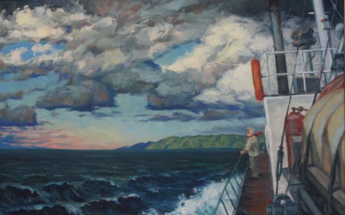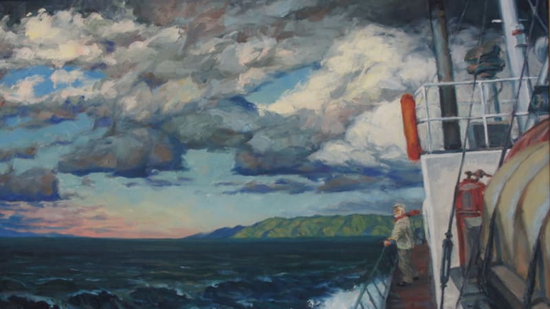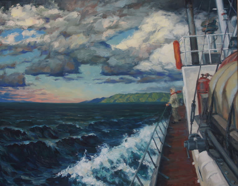 Если говорить о предпочтениях живописца, то это, без сомнения, Байкал, несравненный, непо-вторимый, вечный в своей гордой красоте. Добрая треть экспозиции посвящена этому чуду природы: «Вид на большой Бакланий остров в Чивыркуйском заливе», «Харанцы», «Мыс Лударь у с. Байкальского», «Непогода на мысе Заворотный», «Цветы в Чивыркуе», «В бухте Песчаной», «Причал в Листвянке» – эти и другие работы подобны песне, которую художник поёт своим искусством. Одна из последних работ, датированная 2014-м годом – «К дальним берегам», – без сомнения, тоже штрих к биографии художника. Неспокойная водная стихия, тучи, предвещающие грозу, справа, по краю холста, часть палубы теплохода с человеком у борта. Его взгляд устремлён к горизонту. На свежем ветру развивается красный шарф. Подумалось: очень уж похож этот бородач на создателя сей картины. Оказалось, что так оно и есть.