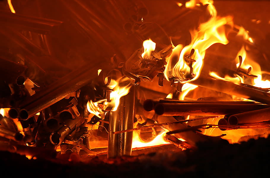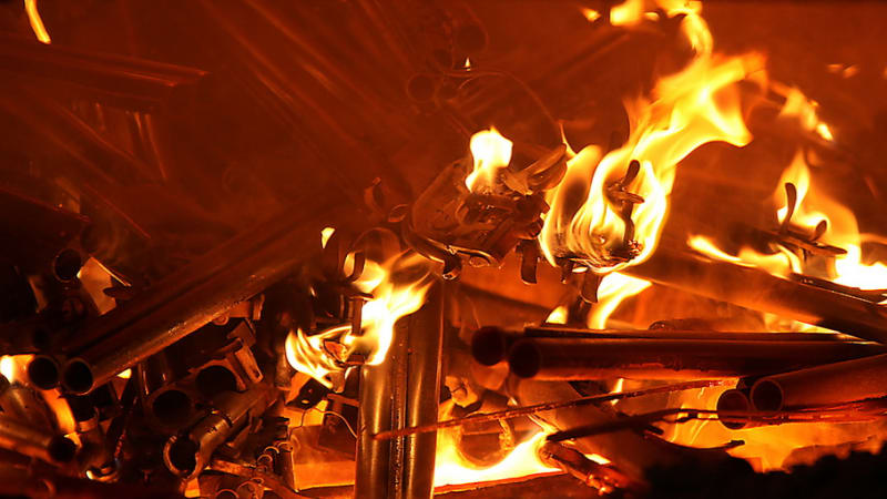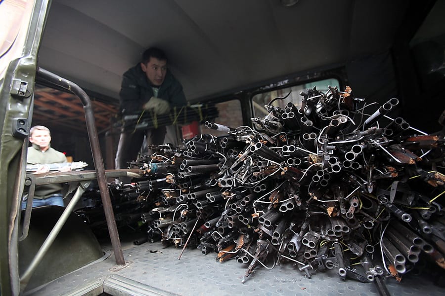 Всё остальное оружие, сданное и изъятое за последние полгода, уже подготовлено к уничтожению. Для этого у карабинов и винтовок снимаются все деревянные детали – чтобы при переплавке они не создавали лишний шлак, их сжигают отдельно. Перед этим всё оружие сверяется по номерам в акте уничтожения. Голые стволы, связанные в вязанки, как хворост, теряют свой угрожающий смысл. В армейского вида деревянных ящиках металлическим мусором лежат разобранные части пистолетов. За процессом подготовки к уничтожению внимательно наблюдает комиссия – в неё входят представители разрешительной системы, экспертно-криминалистического центра, отдела вооружения, окружного управления УВД и УСБ.