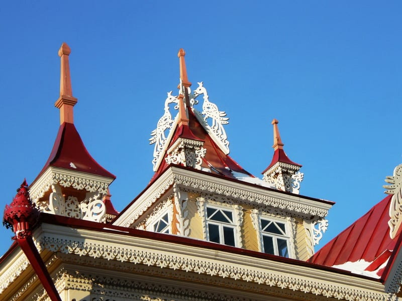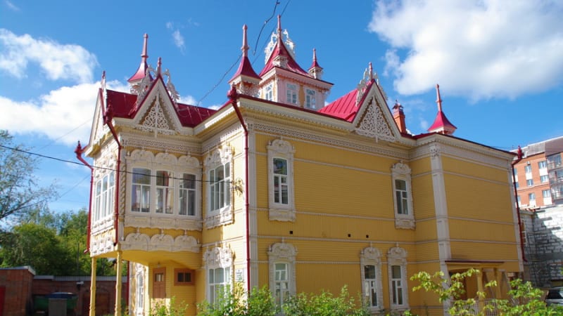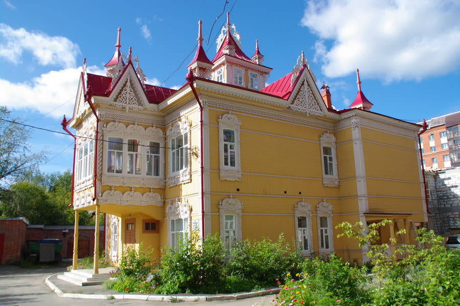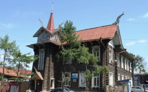 В Томске строго следят тем, как и где в центре паркуются автомобили, а тем более общественный транспорт, поэтому наш автобус не может остановиться возле дома с шатром, но экскурсовод успокаивает: здесь много подобных резных домов. В Томске большинство деревянных памятников двух-трёхэтажные, в отличие от одноэтажных иркутских. Чтобы не замерзнуть суровой сибирской зимой, мастера при постройке домов использовали различные энергосберегающие технологи. Так, окна на первом этаже всегда были намного меньше оконных проёмов на втором. Между этажами обязательно находился земляной утеплитель, поэтому расстояние между полом и потолком достигал одного метра.