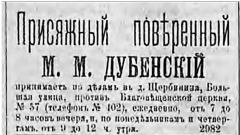 – Напротив Благовещенской церкви, в доме Щербинина, приёмная трёх адвокатов – Дубенского, Кроля и Раевского. И у них расписание так составлено, что кого-нибудь да застанете непременно.