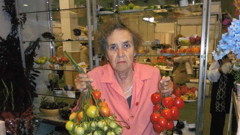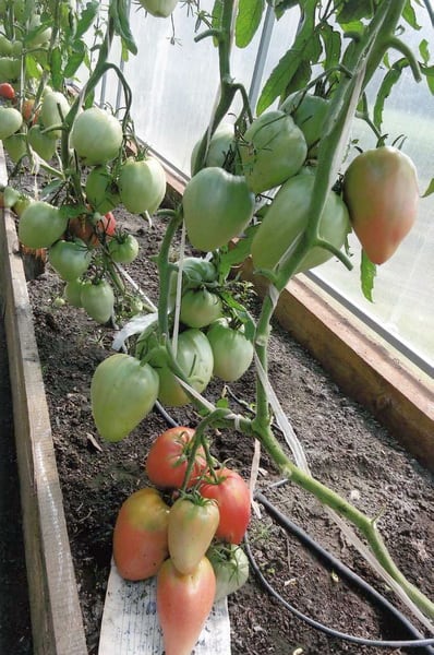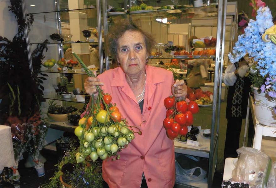 Особая гордость хозяйки – поликарбонатная новая теплица (высота 2,8 м размер 6х3,5 м, цена 60 тыс. руб.). Она рассказывает, что впервые нынче получила такой ранний и отменный урожай. Меня, как помидорницу, а я выращиваю всегда около 40 разных сортов помидоров, впечатлили крупные, очень красивые плоды разных сортов и цветов: красных, розовых, бурых и зелёных (не спелые). Особо выделялись Вельможа, Орлиное сердце, Чудо земли, Италия и другие. Немного было гибридов. Однако сорт Забайкальское чудо превзошёл все ожидания. Он был посажен в углу теплицы, а под огромную кисть пришлось сооружать специальный столик. Этот сорт я сама очень люблю, выращиваю в 2 ствола и оставляю 3-4 кисти. Кисть у сорта очень большая, бывает весом до 2–2,5 кг и обязательно требует подвязки. Томаты эти засолочные весом от 150 и менее граммов. У Александры Дмитриевны же Забайкальское чудо выращивалось в один ствол и единственная громадная кисть из 66 (!) плодов стала украшением стенда на августовской выставке в Сибэкспоцентре.