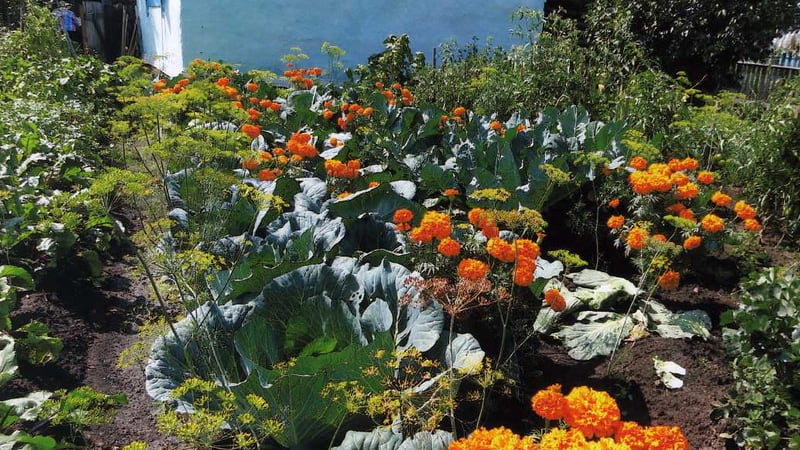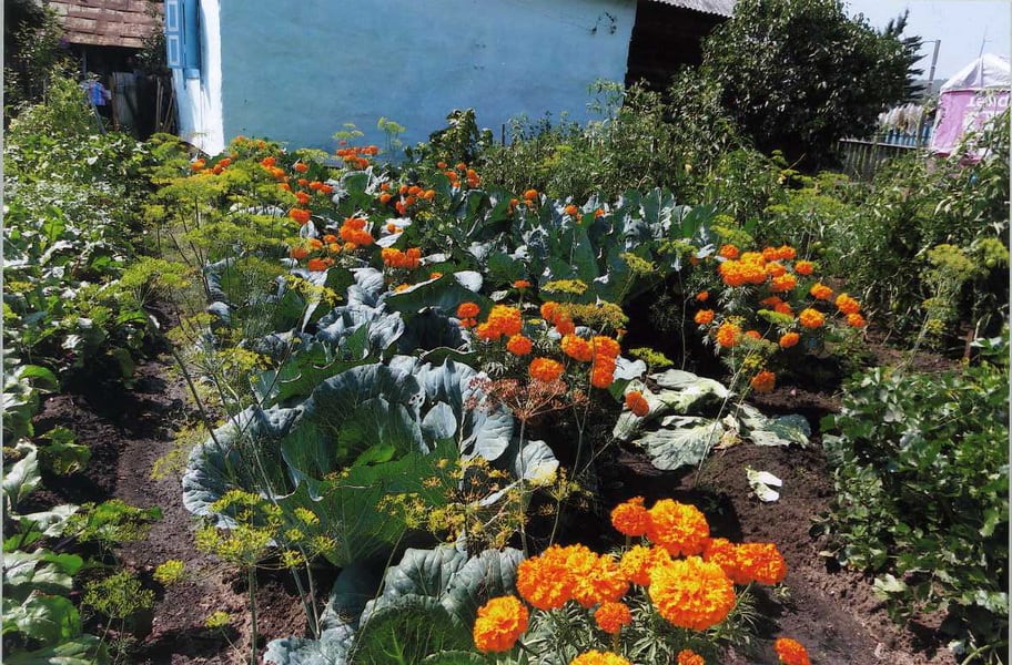 Часть огорода у Александры Дмитриевны занимает картофель, причём 1/3 земли ежегодно засаживается сидератами, в частности горчицей, которые удобряют и оздоравливают почву. Например, проволочник не любит горчицу и полностью уходит с участка. А ведь избавиться от этого вредителя не так-то просто. И овощные гряды чистые, прополотые. Уже август предвещал большой урожай на капустной гряде. Думаю, что рассаженный между кочанами тагетис также работал на урожай. Ведь высокие и яркие бархатцы (шафран) – не только украшение участка. Давно известно, что их цветы своим запахом отпугивают бабочку-белянку, именуемую также капустницей.