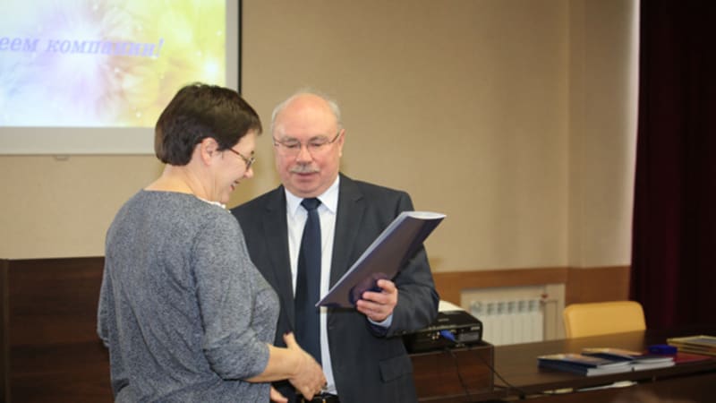 Старейшие работники компании ведущий инженер ПТО ООО «Иркутскэнергосбыт» Павел Семёнович Аносов и начальник службы технического аудита Мария Петровна Стрельцова в этот день получили знаки «Иркутскэнерго» от главного инженера компании Евгения Новикова -