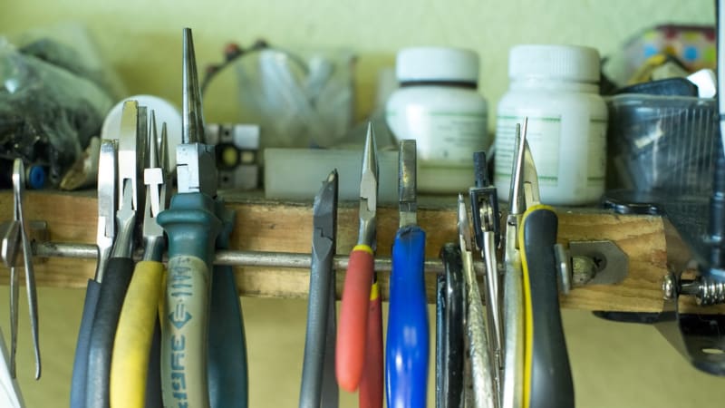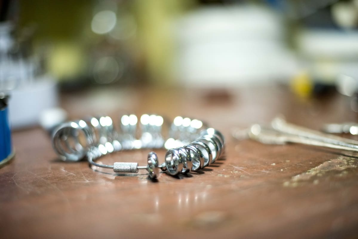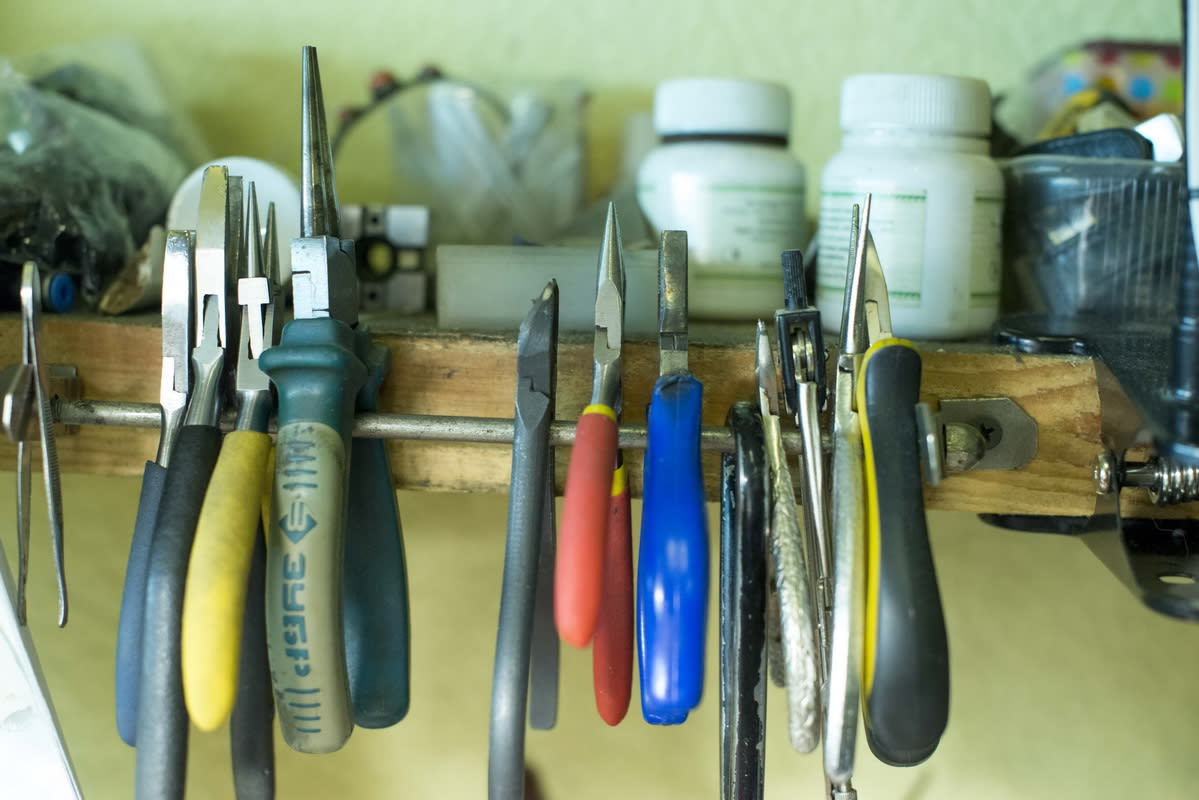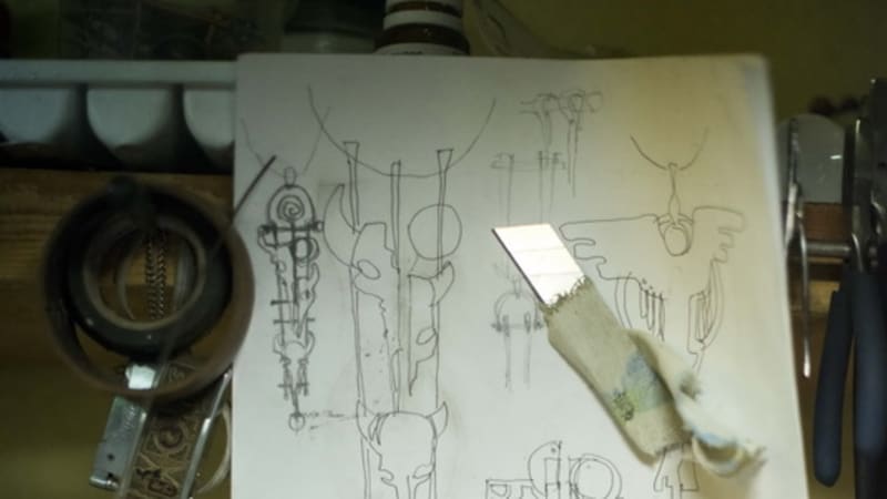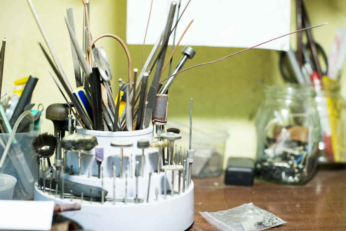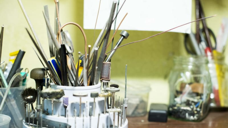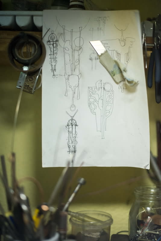 Из привычных глазу предметов – лишь блокнот с набросанным эскизом подвески, кольца и серёг. К базовым инструментам относится, естественно, бормашина. Да такая, что просто рвёт металл, оборотов она даёт намного больше, чем главный инструмент стоматологов. Вальцы для раскатки металла, миниатюрные ювелирные наковаленки, шлифовальня, штихели, шаберы и надфили, мягкие молотки (тоже специальные, ювелирные) – всё это собирается в течение жизни под себя, под свою руку: