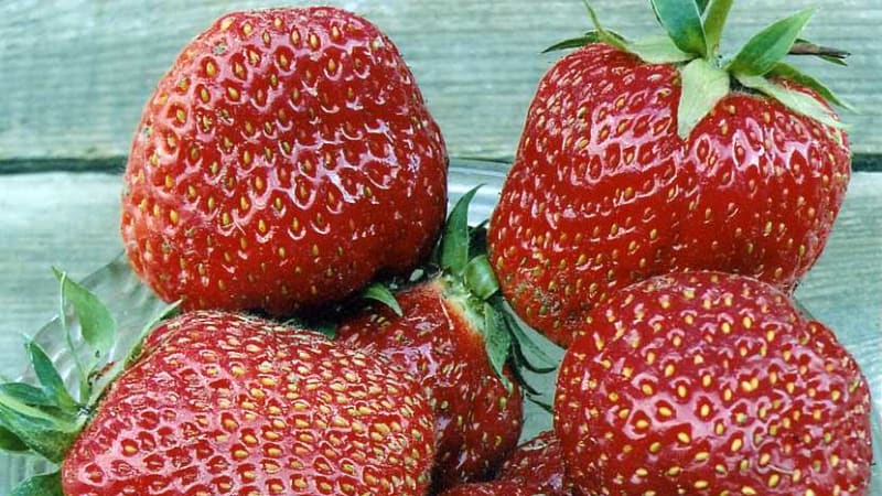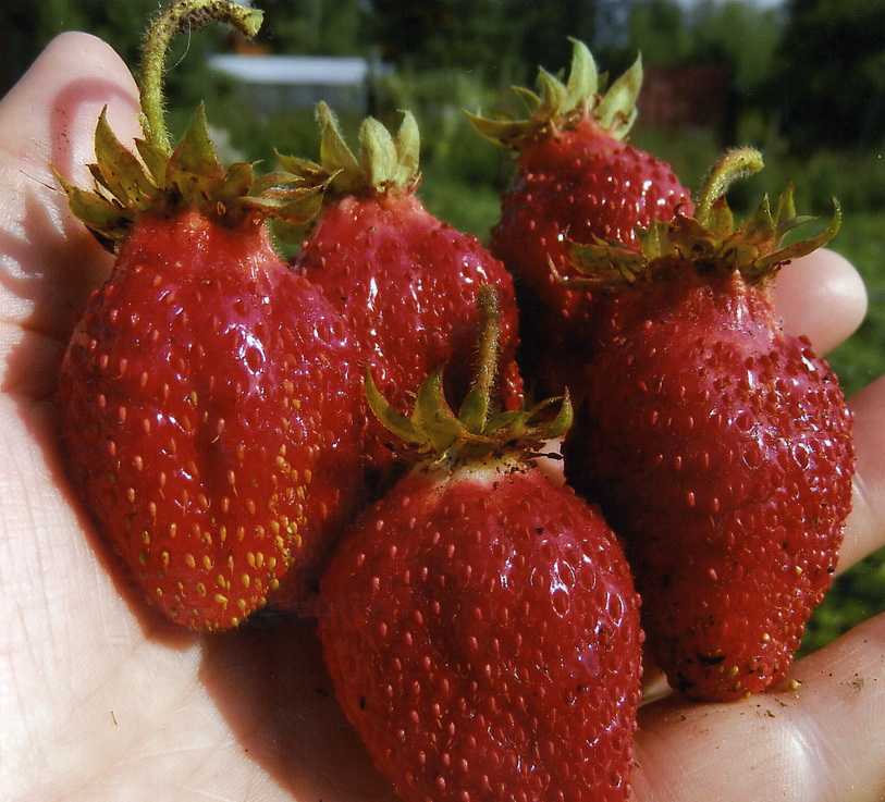 Ягоды разные по форме, но в основном округлые и ребристые, с хорошо выраженным перешейком и отогнутыми чашелистиками. Они тёмно-красного цвета, блестящие, с плотной ароматной тёмной мякотью, гармоничного кисло-сладкого вкуса. Усов даёт немного. Толстые и длинные, они тоже способствуют пополнению урожая крупными ягодами, созревающими на их розетках.