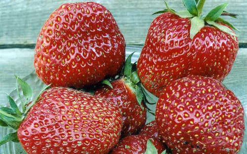 По форме это удлинённый конус до 70 г, как у сортов Вима Рина и Альбион, немного покороче у Свит Мэри. А для Свит Евы и Флорентины характерны более округлые формы в виде широкого конуса. В основном ягоды крупные (от 30 г) с удивительно близкой качественной характеристикой. Они необыкновенно привлекательные, насыщенного красного и тёмно-красного цвета, с блестящей поверхностью и очень плотной красной мякотью, ароматные, гармоничного кисло-сладкого вкуса, который сохраняется и в позднеосеннее время. Завидная у них устойчивость и к земляничным напастям. Даже вездесущая бурая пятнистость незначительно поражает листья и только в холодный осенний период.