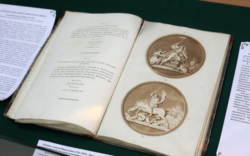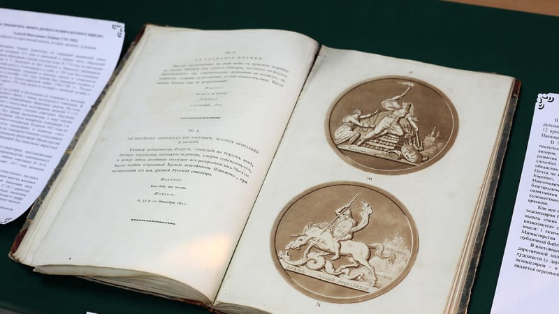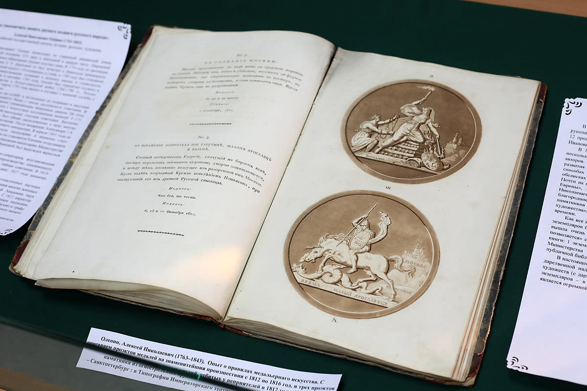 «Алексей Оленин составил очерк, посвящённый истории развития медальерного искусства, – рассказывает библиотекарь. – В книге есть рассуждения президента Академии художеств о способах увековечения памяти ратного подвига русского народа в медалях, обелисках и памятниках, 15 рисунков медалей, которые Оленин комментирует. Почти на всех медалях представлен образ Александра I. В античных фигурах, изображённых на медалях, угадывается образ царя». Сам Оленин целью книги считал следующее: «чтобы сим опытом возбудить благородное стремление в соотечественных художниках к произведению изящных памятников искусства», «явить свету и оставить потомству изящные произведения художества», напоминавшие «о неимоверных событиях» того времени. Как свидетельствуют специалисты Государственного Эрмитажа, труду Алексея Оленина не повезло – по рисункам, помещённым в его книге, была отлита одна медаль, и та через сотню лет после выхода в свет книги. Однако в 2010 году к юбилею Отечественной войны 1812 года петербургским скульптором-медальером Алексеем Архиповым были отлиты все 15 медалей.