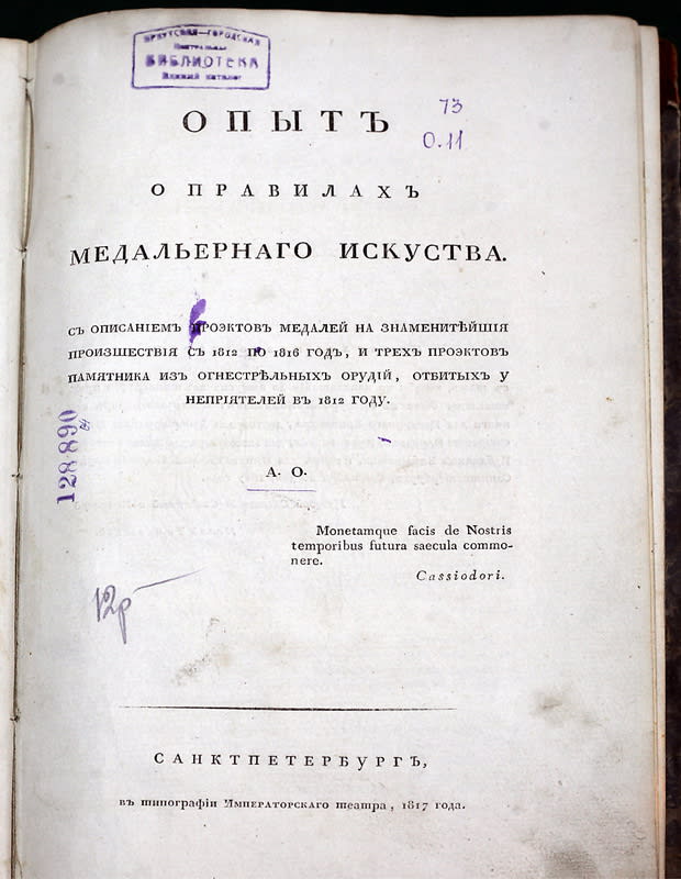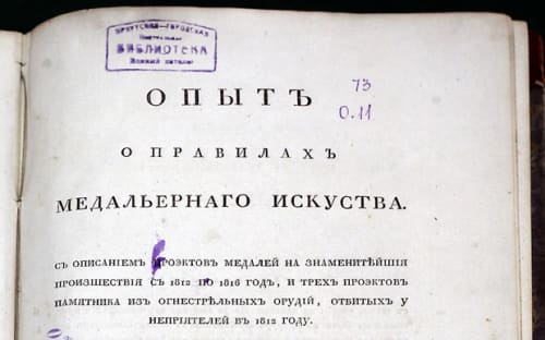 Эта книга никогда не продавалась. Никто не знает её тираж. Автор книги «Опыт о правилах медальерного искусства» подписался инициалами А.О. Сейчас в России известно только девять экземпляров этого издания. Восемь из них находятся в европейской части России, например, в Эрмитаже, в Российской государственной библиотеке. А девятый был обнаружен в конце 2013 – начале 2014 года сотрудниками отдела историко-культурного наследия библиотеки им. И.И. Молчанова-Сибирского в редком фонде «Молчановки». В минувший вторник книга, датируемая 1817 годом, была выставлена на всеобщее обозрение. Только один день можно было полюбоваться книжным памятником федерального значения.