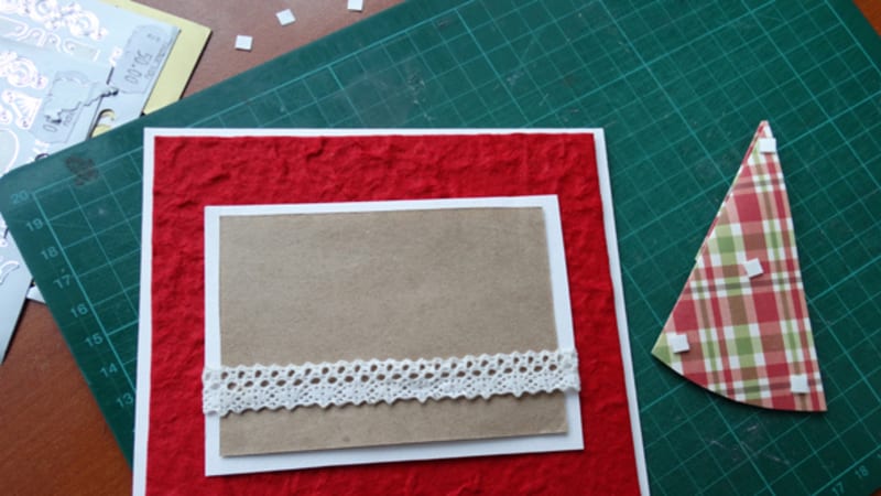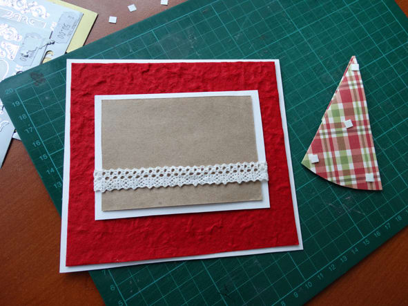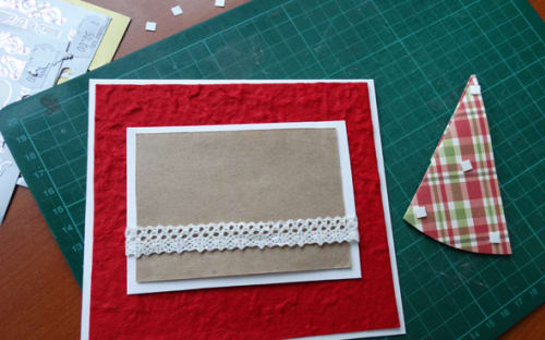 2. Из листа красной бумаги делаем квадрат на 0,5 см меньше, чем заготовка, и соединяем с ней двухсторонним скотчем.