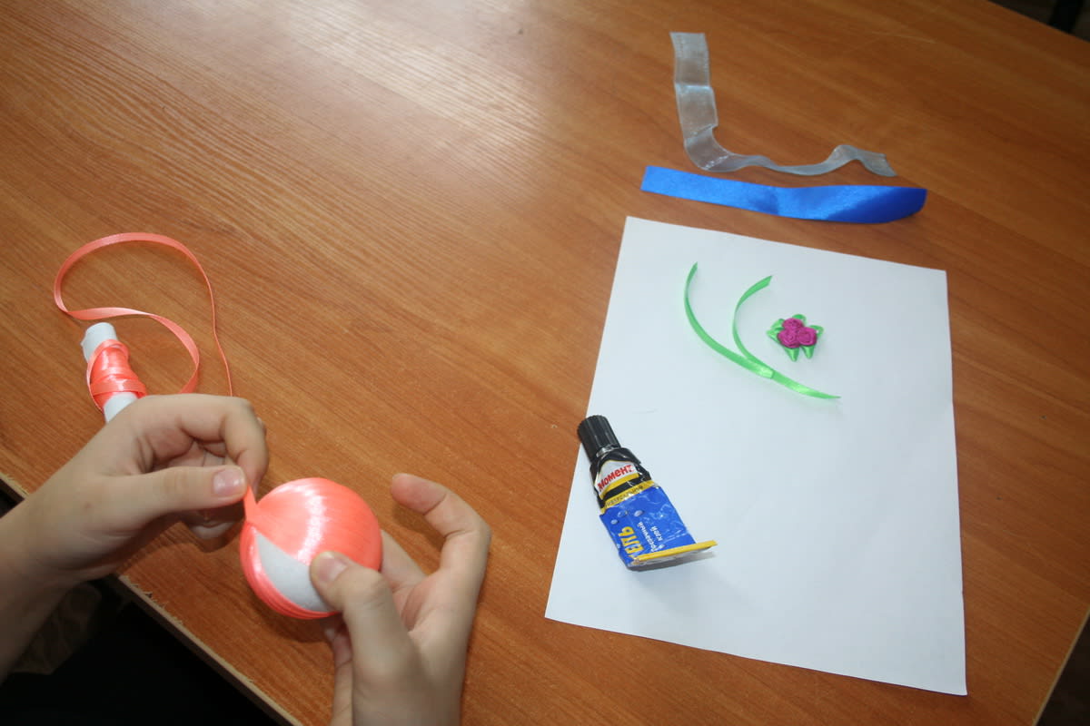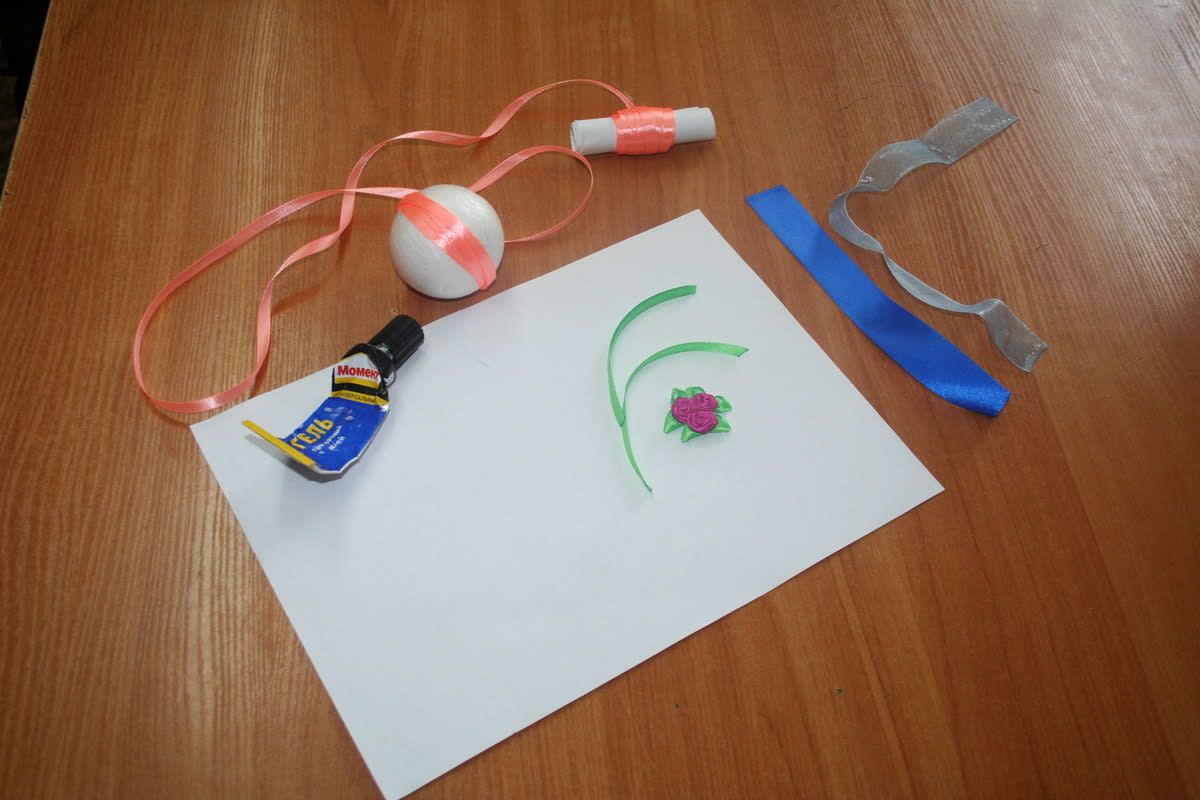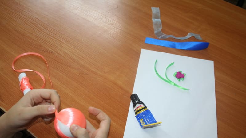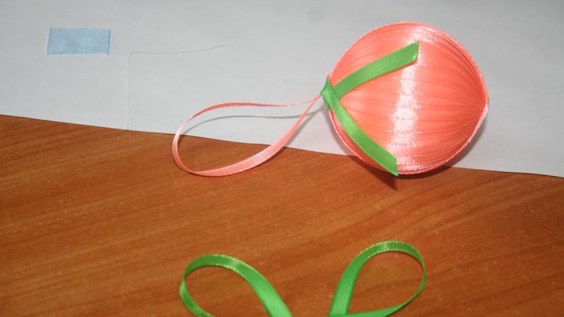 1. Край атласной ленты намазать клеем и начать обматывать шарик, оставив хвостик для подвешивания игрушки.
