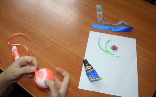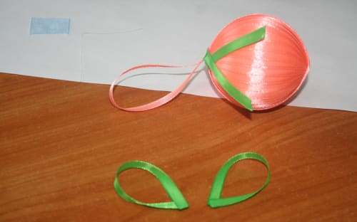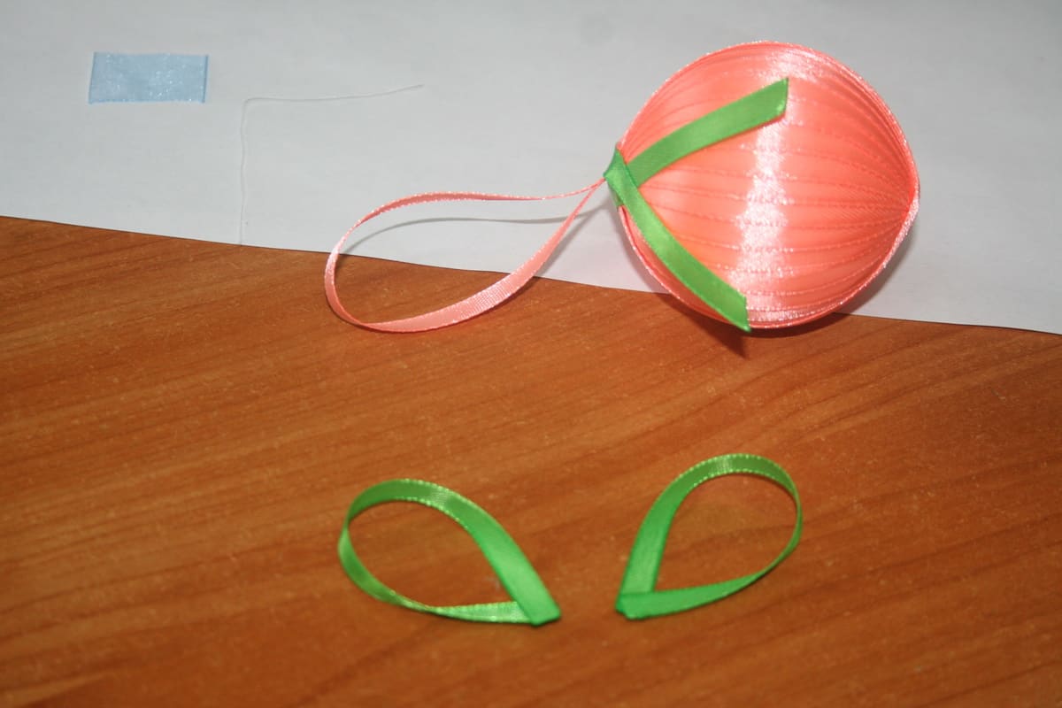 6. Берём оставшиеся ленты, одну закрепляем на шаре из двух других, делаем петельки.