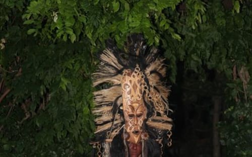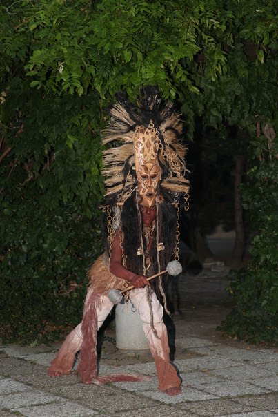 В положении конкурса сказано, что можно привезти только один look (так модельеры называют костюм). Наряд, который решили представить, имеет эффектный головной убор: на голову модели надевается огромная африканская маска, к которой привязаны длинные конские волосы.
