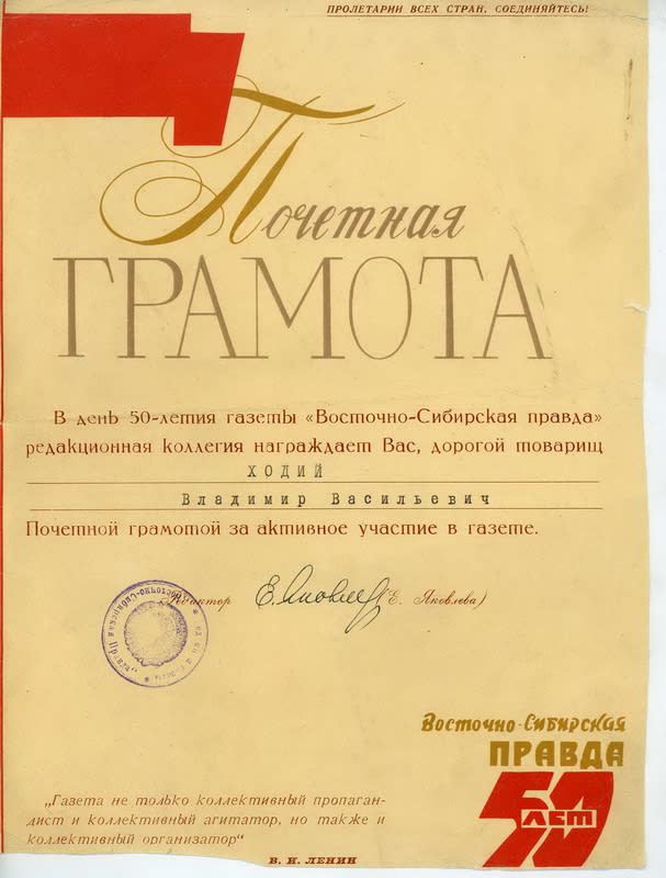 Держу в руках скромную на вид, но одну из памятных своих наград: «Почётная грамота. В день 50-летия газеты «Восточно-Сибирская правда» редакционная коллегия награждает вас, дорогой товарищ Ходий Владимир Васильевич, Почётной грамотой за активное участие в газете. Редактор Е. Яковлева».