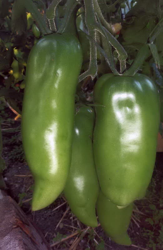 Не могу не рассказать об очень урожайном и необычном сорте – Свеча на ветру. Высота кустов 2–2,5 м, форма плодов – длинные толстые сосульки с острым носиком, иногда загнутым. Длина плода 12–15 см, толщина 4–5 см. Томаты красного цвета массой 100–150 г, плотные, хорошего вкуса, предназначены для длительного хранения. Сорт позднеспелый. До самого декабря я готовлю из него салаты, употребляю в пищу.