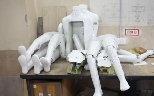 – Можно применять машинную. Но тогда человек останется без работы, – вздыхает Евгений. – Потом всё это монтируется в пластиковый каркас, распаивается схема, собирается. Обтягивается силиконом, как кожа, сверху. И он приобретает вид человека. Проверяется работоспособность сенсорной панели и звуковое сопровождение.