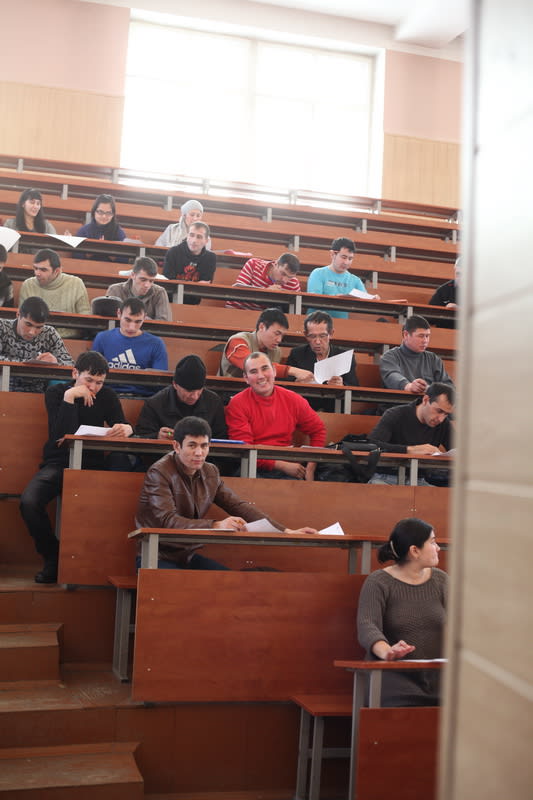 «Кто-то, например, из Нижнеудинска приехал, – не отправишь же его назад», – объясняет Нина Рогозная, которая за десять минут до нашей беседы дала карт-бланш беременной женщине. Впрочем, приезжим хватает и тумаков. После 40 минут в очереди и петляний по сложносочинённым корпусам политеха они слышат: «Что, нельзя было пораньше прийти? Экзамен на сколько назначен?» Пришли, говорят, а сами же не пускали. В итоге всю честную компанию переводят в помещение с амфитеатром: обычная аудитория для второй группы иностранцев слишком мала, а опоздавшие продолжают прибывать. В районе половины одиннадцатого экзамен наконец стартует. Через дверную щель то и дело кто-то наблюдает. Экзаменуемые внимания на это почти не обращают: кто-то вращает головой туда-сюда, пытаясь заглянуть в чужой тест, кто-то задумчиво грызёт ручку и ерошит волосы, кто-то улыбается.