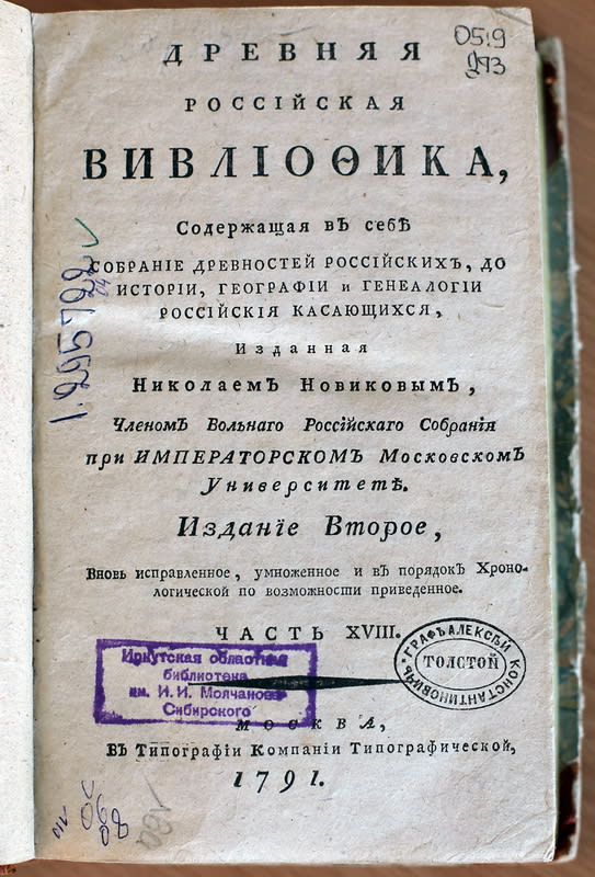 «Ожидания Новикова от издания «Вивлиофики» не оправдались, – говорит Анна Малых. – Многотомная серия ухудшила его финансовое положение, так как государство выделило только тысячу рублей и 200 голландских червонцев. А было потрачено в 2-3 раза больше, чем Новиков первоначально запланировал. Цена на тома в продаже была завышена, книга плохо раскупалась. Тем не менее лучшие умы той эпохи, к примеру Александр Сумароков, Михаил Херасков, лично знакомые с Николаем Ивановичем, покупали это издание. «Вивлиофика» была и в библиотеке Екатерины II. Один из экземпляров, хранящихся в нашем редком фонде, принадлежал графу Алексею Толстому, о чём свидетельствует экслибрис-штемпель на титульном листе».