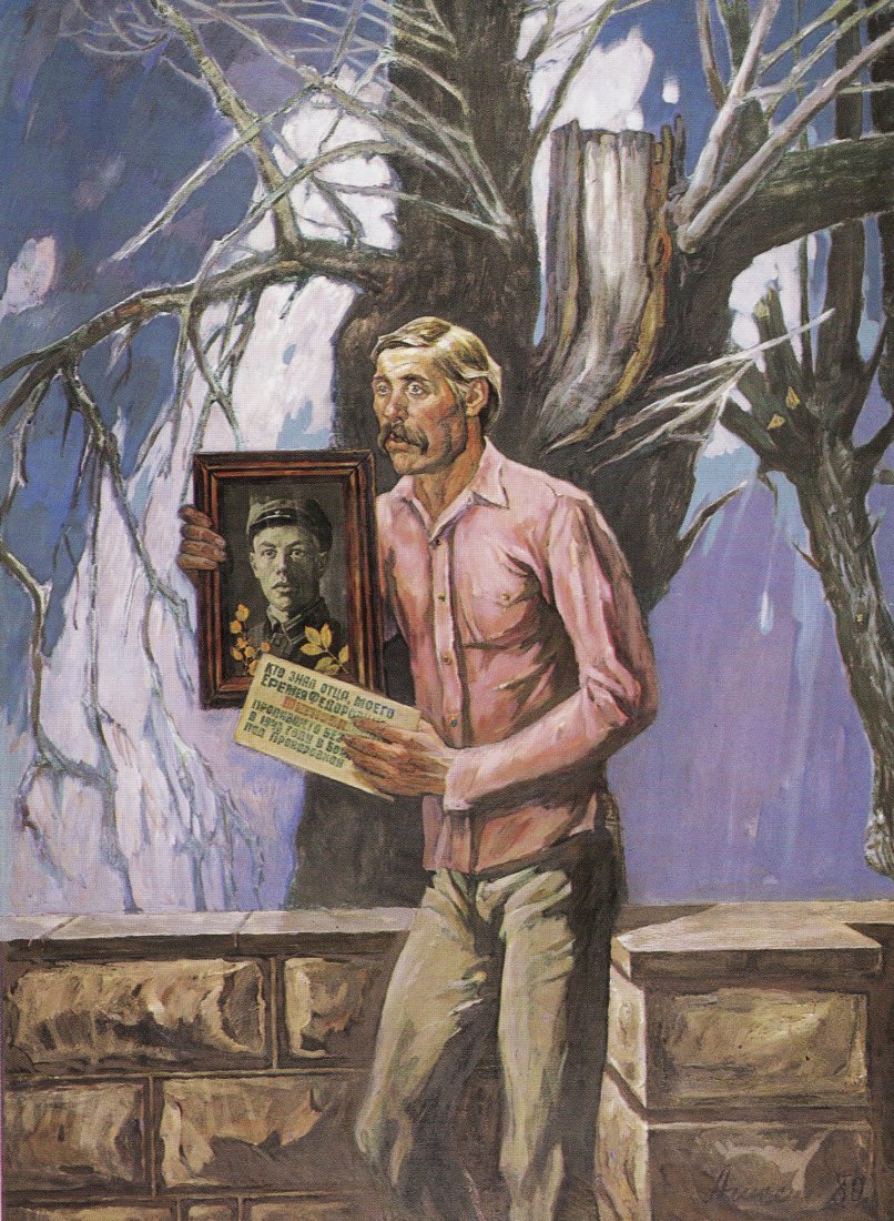 А в «Отце», крепко, весомо, прочно стоящем на земле, у стен родного дома, ощущение опоры, надёжности выражено так, что подобно внуку, изображённому здесь же, испытываешь добрую заботливую силу положенной на плечо мальчика руки, испытываешь состояние защищённости. Как подметил в своё время искусствовед Анатолий Дмитренко, композиционная определённость диптиха, содержательность живописи, ясность позы, жеста, выражения дорогих лиц – во всём высокая правда благодарности отчему дому.