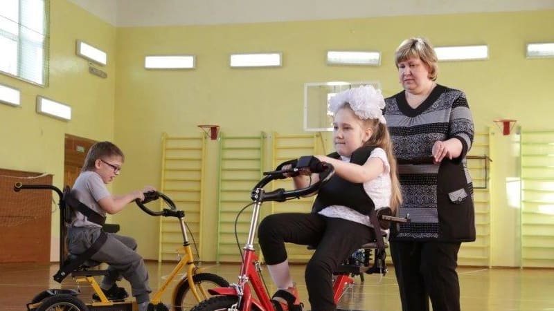 Между тем коридор приводит нас в спортивный зал. Там у первоклашек из «особого» класса как раз идёт урок физкультуры. Малыши с диагнозом ДЦП дружно гоняют по залу… на велосипедах. Только это не простые велосипеды, а специальные, трёхколёсные, купленные по заказу для детей с нарушениями опорно-двигательной системы. Маленькие пассажиры пристёгнуты широкими ремнями, на каждом надет жилет, который помогает фиксировать положение тела.