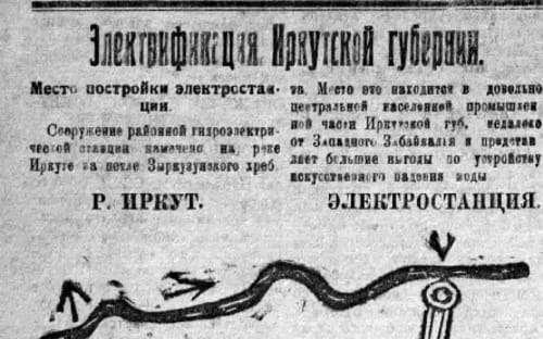 В начале 20-х годов прошлого века Иркутск грезил первой гидростанцией. В 1924 году был представлен широкой публике проект строительства гидростанции на Зыркузунском хребте на реке Иркут. С картинками-планами, с экономическим обоснованием цены «килоуатт часа» (именно таким в 20-х было написание единицы измерения количества произведённой или потреблённой энергии. – «ВСП») в домашнем обиходе. Инженер В. Шмидт настаивал на создании акционерного общества по электрификации губернии, а акционерами предлагал назначить «подавляющее большинство граждан, населяющих наш край». Стоимость станции в 52 тыс. лошадиных сил оценивалась в 7,4 млн советских рублей. Сейчас с удивлением читаешь о том, как высчитывалась цена электроэнергии для населения. В переводе на «фунт картошки» или поджарку четырёх котлет. Проект не осуществился, но именно тогда впервые была высказана идея о создании гидроузла на реках Сибири.