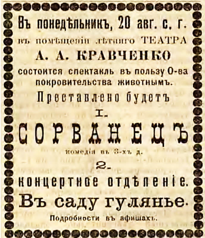 О том, что в Иркутске, вероятно, откроется Общество покровительства животным, «Восточное обозрение» сообщило в номере от 7 сентября нынешнего, 1900 года. «По крайней мере, – уточнила газета, – устав за подписью 50 человек уже послан на утверждение». Кстати, было очень непросто найти пятьдесят персон, хорошо известных и при этом не раздражавших господина губернатора. А без резолюции губернатора в Петербурге и не взглянули бы ни на какие бумаги из Иркутска. Что же до самих бумаг, то тут неожиданно обошлось без хлопот: некто Ванцлов давно уже вёл переписку об открытии филиала Российского общества покровительства животным. Располагал он, естественно, и уставными документами и был в курсе новых законодательных предположений.