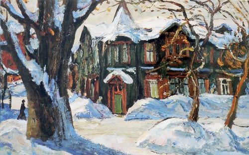 Альбомов с изображением Иркутска действительно немало. Глядя на картины, не можешь отделаться от ощущения, что где-то ты это уже видел: незнакомый деревянный домик в снегу кажется неуловимо родным. «Смотрите, Анатолий Костовский – его с Владимиром Кузьминым называют певцами Иркутска. Одно из его любимых мест города – мост со стороны Левобережного округа: вдалеке виднеется Крестовоздвиженская церковь и заметна пожарная каланча. Так могло быть. Вот реальный дом, его уже не существует, но рядом был колодец, – продолжает Надежда Куклина, показывая уже другую картину в альбоме. – Художников ведь можно считать летописцами города, которого нет. В их работах он остался: вот посмотрите, каким был 130-й квартал, здесь написано «Улица Нижняя Амурская» – прежнее название 3-го Июля».