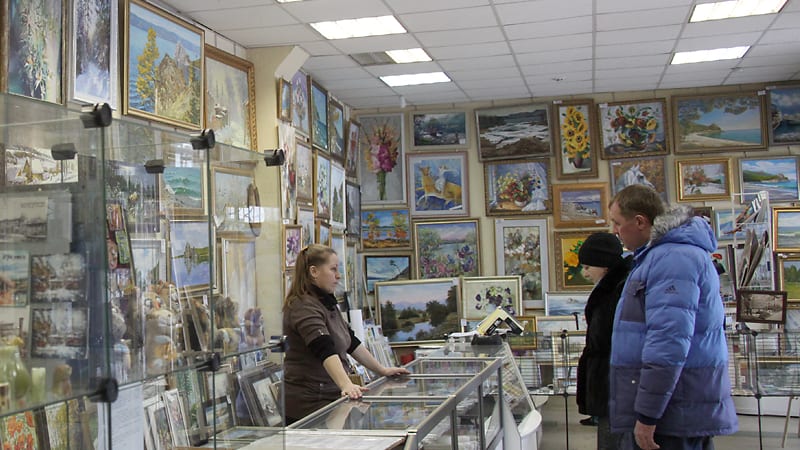 Зайдя в расположившийся по соседству салон «Художник», Куклина начинает буквально по именам перечислять авторов размещённых картин, хотя неподготовленный глаз разницы между салонными и уличными изображениями может и не увидеть.