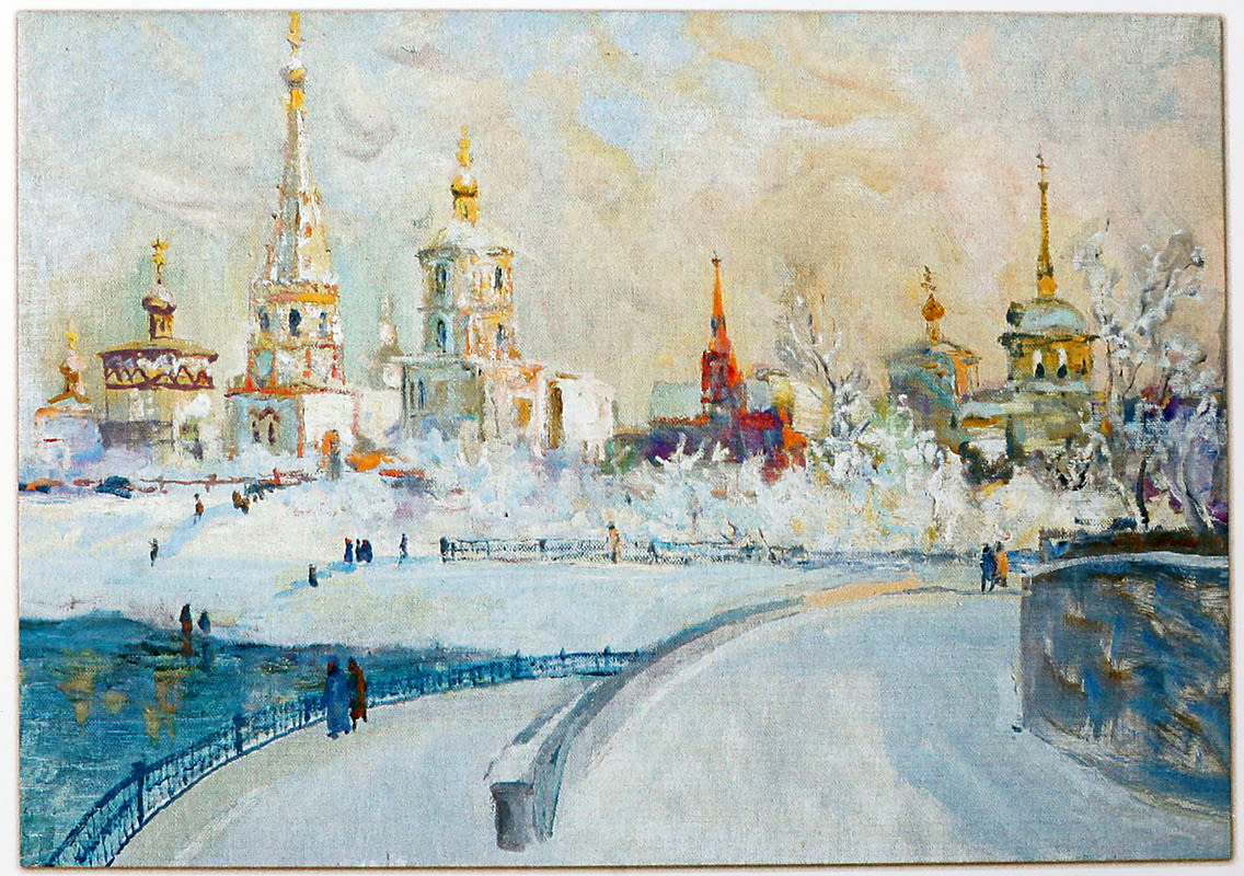 Альбомов с изображением Иркутска действительно немало. Глядя на картины, не можешь отделаться от ощущения, что где-то ты это уже видел: незнакомый деревянный домик в снегу кажется неуловимо родным. «Смотрите, Анатолий Костовский – его с Владимиром Кузьминым называют певцами Иркутска. Одно из его любимых мест города – мост со стороны Левобережного округа: вдалеке виднеется Крестовоздвиженская церковь и заметна пожарная каланча. Так могло быть. Вот реальный дом, его уже не существует, но рядом был колодец, – продолжает Надежда Куклина, показывая уже другую картину в альбоме. – Художников ведь можно считать летописцами города, которого нет. В их работах он остался: вот посмотрите, каким был 130-й квартал, здесь написано «Улица Нижняя Амурская» – прежнее название 3-го Июля».