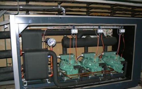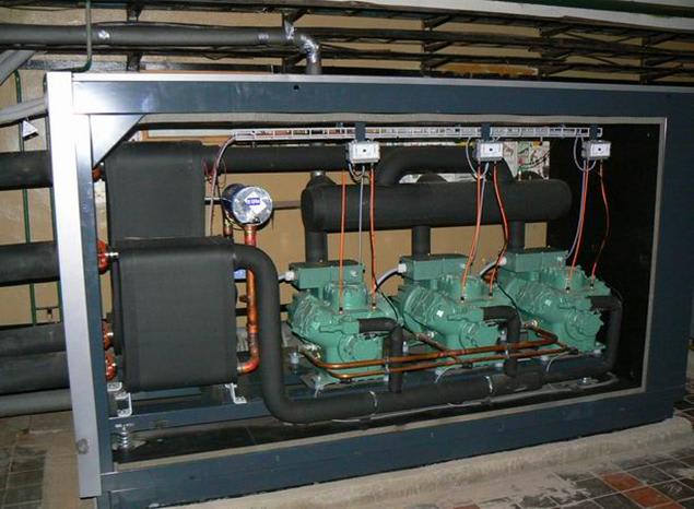 В то же время сама работающая станция поставляет дармовое тепло – нагретую до 20 градусов по Цельсию воду из систем охлаждения трансформаторов, которую сбрасывают в Ангару. Технология его отбора через систему теплообменников для дальнейшего использования известна давно: первый действующий тепловой насос был собран ещё в позапрошлом веке, а широко применять их в скандинавских странах начали во второй половине прошлого века. Заключается она в том, что источник низкопотенциального тепла, в роли которого могут выступать сточные воды или атмосферный воздух, попадающий в первичный контур, охлаждается, отдавая тепло хладагенту с низкой температурой кипения. Последний поступает в компрессор, где происходит его сжатие под высоким давлением, вызывающее нагрев. В дальнейшем хладагент, перешедший в газообразное состояние, передаётся в компрессор, который отбирает его тепло для нагрева воздуха в помещении или, как в случае с Усть-Илимской ГЭС, воды в системе отопления. Остывший газ, в свою очередь, преобразуется в жидкость и используется повторно. Принцип работы чем-то схож с обычным бытовым холодильником, с той разницей, что отобранное тепло не рассеивается через радиатор, а находит своё применение в системе отопления. Конечно, для этого необходимо затратить электроэнергию, но её расходы в сравнении с той же электробойлерной невелики. Вдобавок теплонасос эффективнее: коэффициент преобразования одного вида энергии в другой у современных установок колеблется в пределах 4-5, то есть один киловатт-час электричества на выходе даёт 4-5 кВт-ч (0,34 – 0,43 Гкал) тепла.
