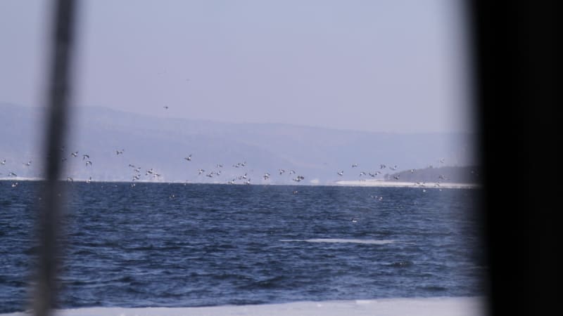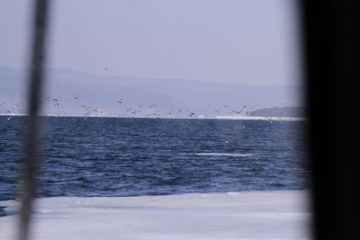 «Хивус» подкрадывается к ближайшей полынье. Вся сложность здесь в том, что птиц легко спугнуть, если подобраться слишком быстро. Поэтому держаться приходится на расстоянии. Отсюда разглядеть стаю удаётся из бинокля.