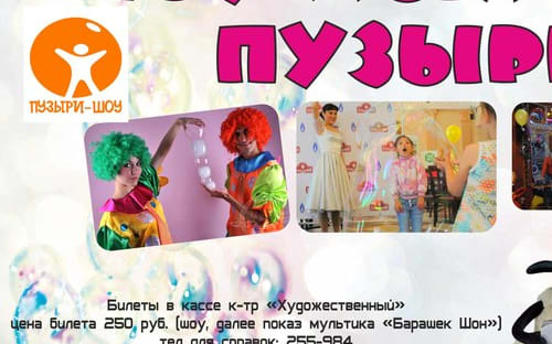 Кинотеатр «ХУДОЖЕСТВЕННЫЙ» Иркутска рассказывает вам радостную новость о том, что вы, дорогие родители, можете провести выходные с детишками у нас! 5 апреля специально для детей «ШОУ ГИГАНТСКИХ МЫЛЬНЫХ ПУЗЫРЕЙ»! Сбор в 13.00! Цена билета – 250 руб. С вас – ребёнок, хорошее настроение. С нас – подарки, пузыри, фото и, конечно же, мультфильм!