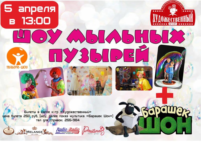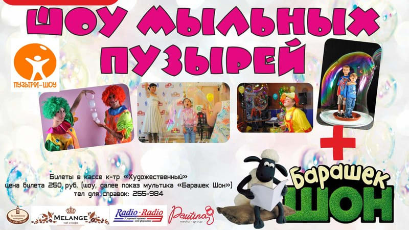 Кинотеатр «ХУДОЖЕСТВЕННЫЙ» Иркутска рассказывает вам радостную новость о том, что вы, дорогие родители, можете провести выходные с детишками у нас! 5 апреля специально для детей «ШОУ ГИГАНТСКИХ МЫЛЬНЫХ ПУЗЫРЕЙ»! Сбор в 13.00! Цена билета – 250 руб. С вас – ребёнок, хорошее настроение. С нас – подарки, пузыри, фото и, конечно же, мультфильм!