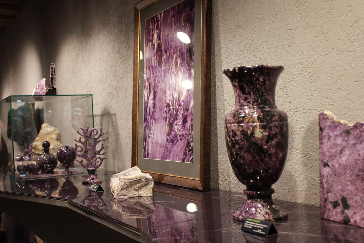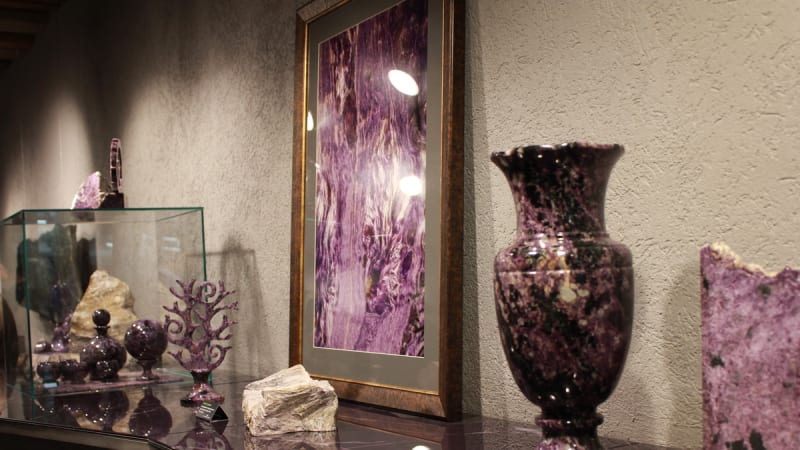 В экспозиции нового минералогического музея, который был открыт в минувшие выходные в селе Смоленщина на базе ОАО «Байкалкварцсамоцветы», можно увидеть вазу из чароита весом 300 килограмм. Сегодня в мире создано всего пять таких ваз. А учитывая, что в Сибири находится единственное в мире месторождение этого красивого сиреневого камня, который с момента его открытия уже успел приобрести всемирную славу, сразу понимаешь, что видишь уникальный экземпляр. Впрочем, есть тут и другие редкие минералы: белый и медовый нефрит, агат, внутри которого растут кристаллы кварца, лазурит, известный как любимый камень Екатерины II, и прочие. Всего в музее сейчас представлено больше тысячи уникальных экспонатов – от образцов необработанного камня до редких декоративных изделий.