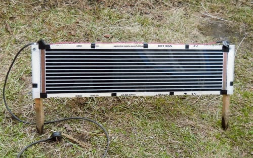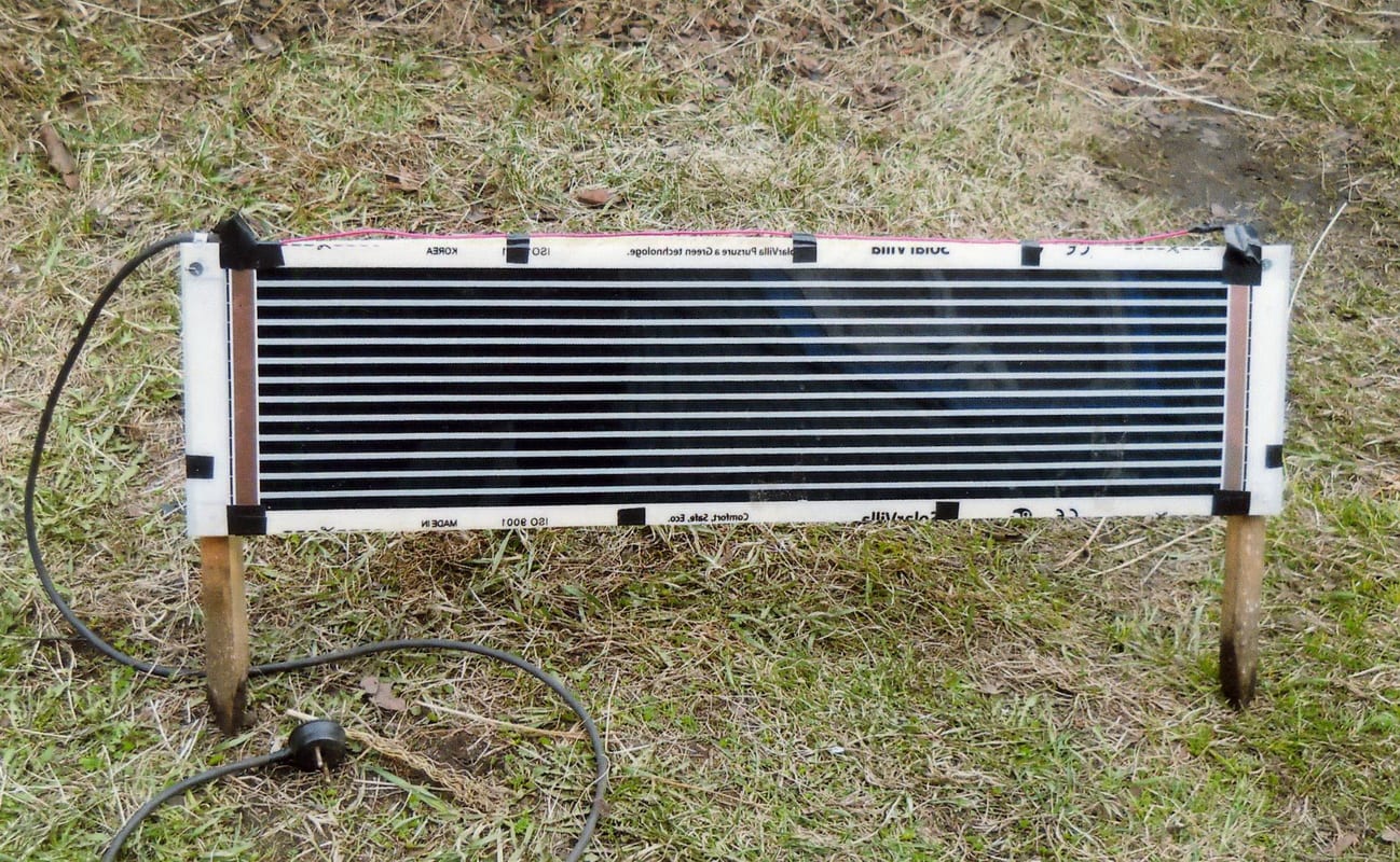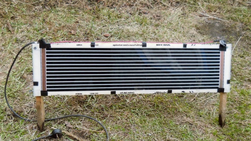 К медным шинам (между ними чёрные полосы – это нагревательные элементы плёнки) подсоединяем провод, и обогреватель готов. Свободных полей, т.е. мест, не занятых шинами и нагревательными (чёрными) элементами, по периметру предостаточно, чтобы её закрепить. Мощность такого обогревателя зависит от ширины и длины полоски. При длине 0,8 м и ширине 25 см она равна примерно 45 Вт. Я ставил сдвоенный подобный обогреватель, хотя в принципе справился бы и одинарный, длина грядки-то всего 2 м.